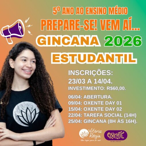 desafios e tarefas lúdico-educativas, a participação na Gincana Estudantil é facultativa. Os alunos que tiverem interesse em participar da Gincana deverão procurar a equipe pedagógica na gerência do seu segmento dentro do prazo de inscrições – 23/03 a 14/04 – e a Oxente