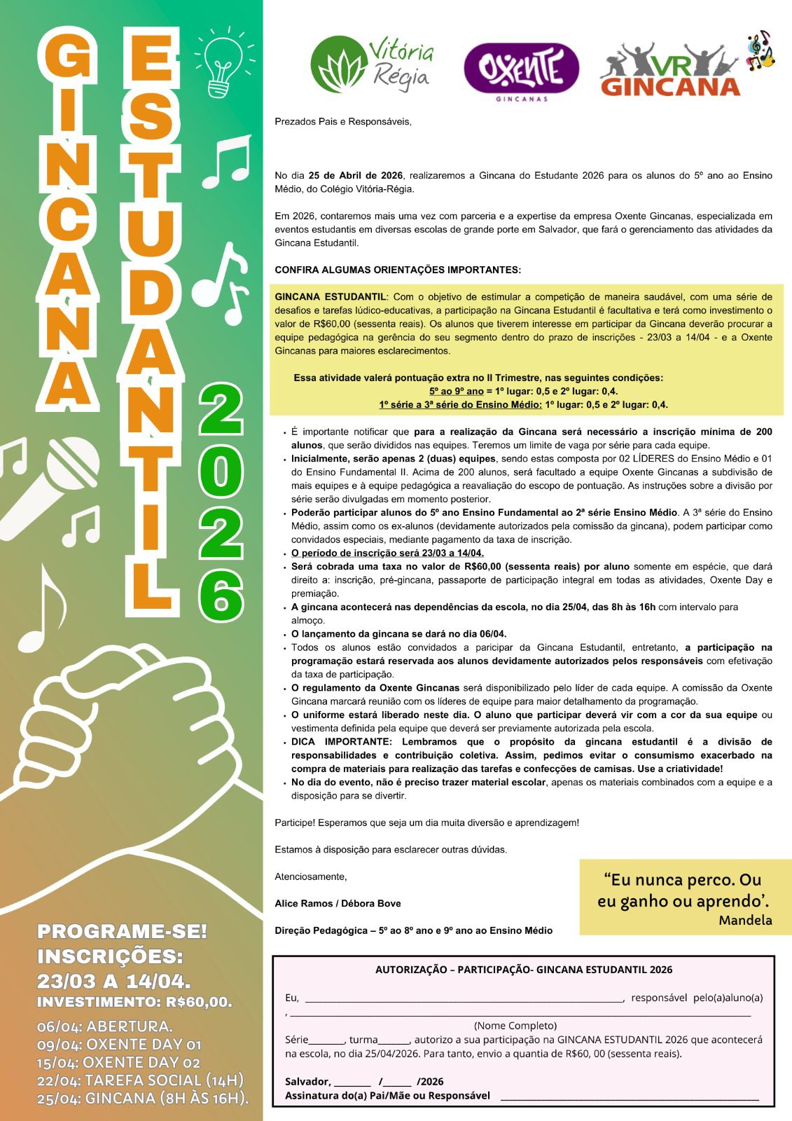 Em 2026, contaremos mais uma vez com parceria e a expertise da empresa Oxente Gincanas, especializada em eventos estudantis em diversas escolas de grande porte em Salvador, que fará o gerenciamento das atividades da